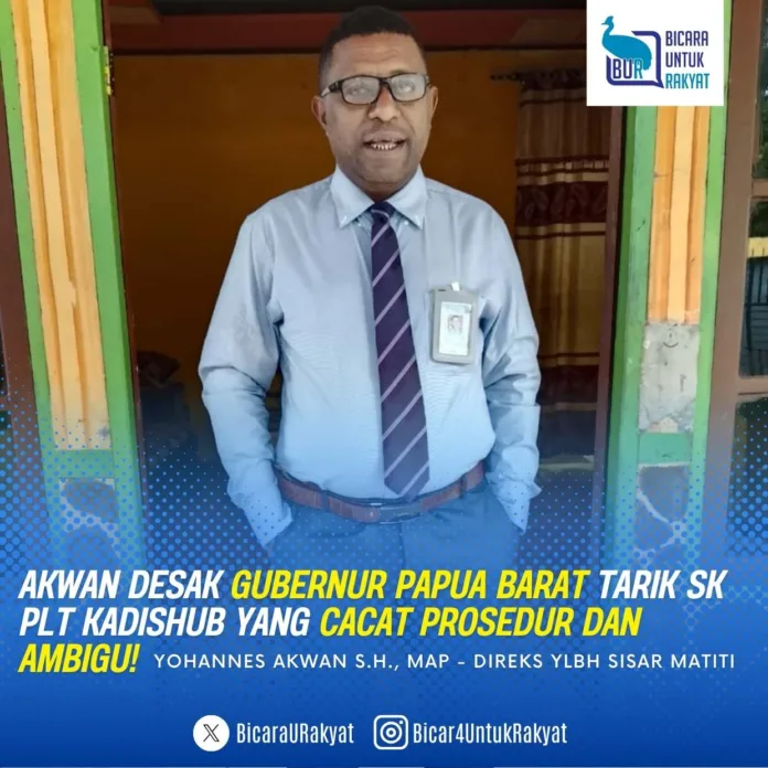 Manokwari – Direktur Eksekutif YLBH Sisar Matiti, Yohanes Akwan, S.H., MAP, mendesak Gubernur Papua Barat untuk segera menarik kembali Surat Perintah Pelaksana Tugas (Plt) Kepala Dinas Perhubungan Provinsi Papua Barat Nomor 800.1.3.3/16/PB/2025 yang diterbitkan pada 2 Juni 2025.