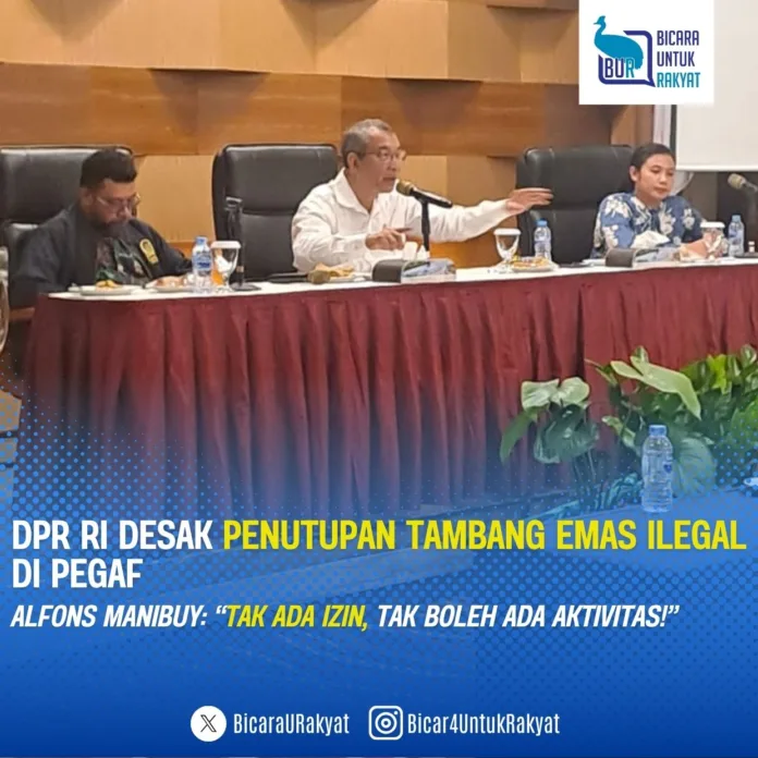 Manokwari, 15 Juni 2025 — Aktivitas tambang emas ilegal yang marak terjadi di Kabupaten Pegunungan Arfak (Pegaf), Papua Barat, menjadi sorotan serius DPR RI. Dalam kegiatan reses yang digelar di Hotel Aston Manokwari, anggota DPR RI Alfons Manibuy menegaskan bahwa seluruh kegiatan pertambangan di Pegaf yang tidak memiliki dasar hukum dan harus segera dihentikan.