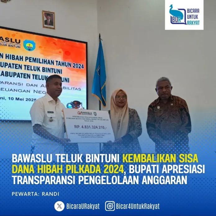 Bintuni — Badan Pengawas Pemilihan Umum (BAWASLU) Kabupaten Teluk Bintuni secara resmi melaporkan realisasi penggunaan anggaran hibah untuk penyelenggaraan Pemilihan Gubernur dan Wakil Gubernur Papua Barat serta Pemilihan Bupati dan Wakil Bupati Teluk Bintuni 2024. Selain itu, BAWASLU juga menyerahkan kembali sisa anggaran ke kas daerah dalam kegiatan yang digelar di Gedung Sasana Karya, Kompleks Perkantoran Bupati Manimeri, Sabtu (10/05/2025).