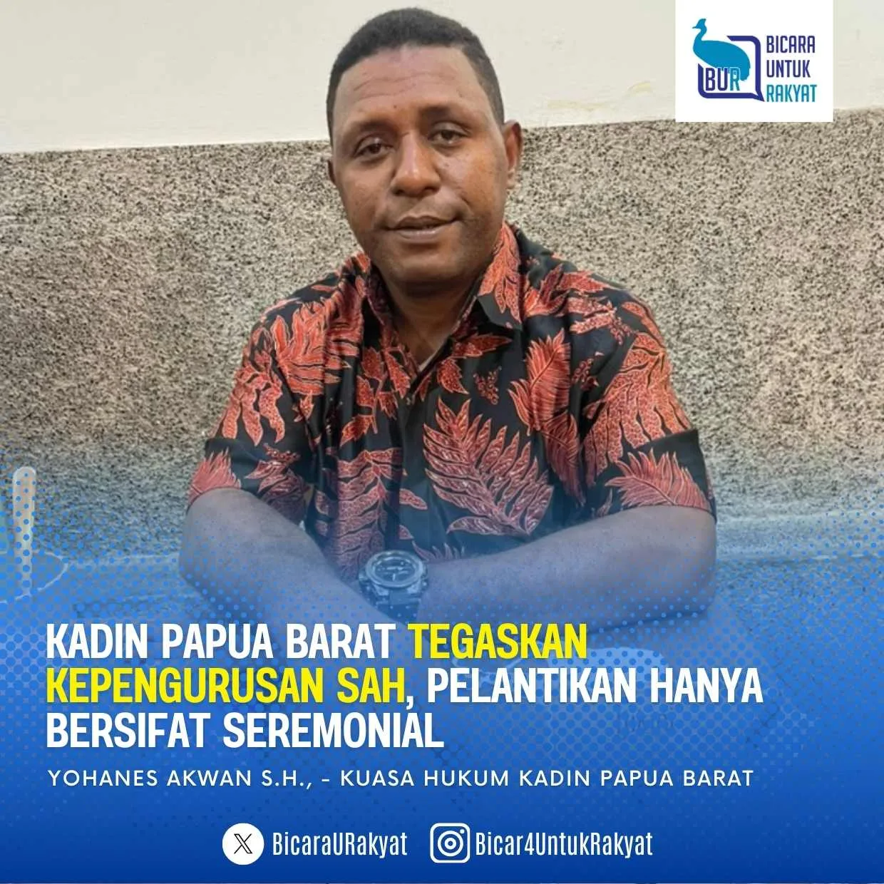 Kuasa Hukum KADIN Papua Barat, Yohannes Akwan, menyatakan bahwa kepengurusan KADIN Papua Barat telah ditetapkan secara resmi melalui Surat Keputusan (SK) yang dikeluarkan oleh KADIN Indonesia. Ia menegaskan, proses pelantikan bukan penentu keabsahan organisasi, karena yang menjadi dasar hukum adalah SK pengesahan dari KADIN Indonesia.
