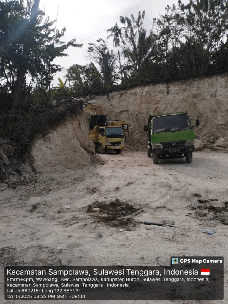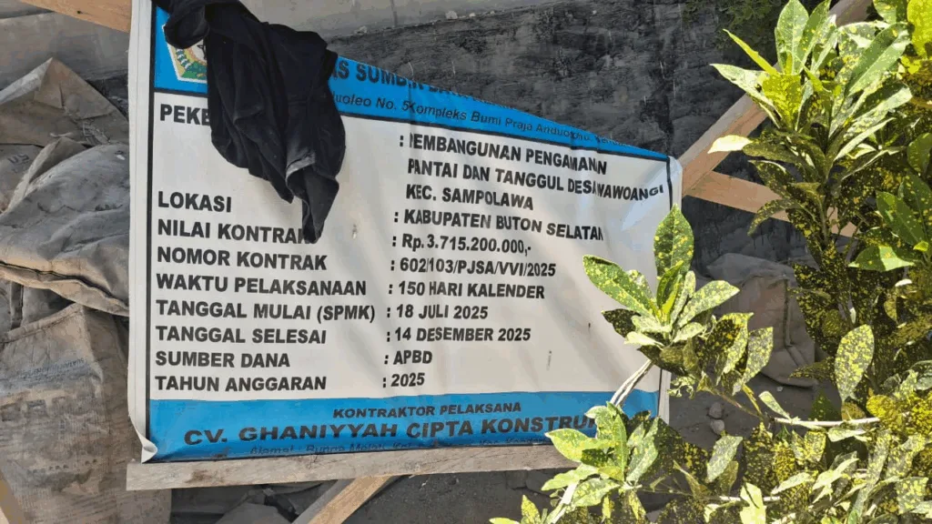 Buton Selatan, 12 November 2025 — Dugaan penggunaan material Galian C ilegal (Mineral Bukan Logam dan Batuan/MBLB) dalam proyek pembangunan pengaman pantai dan tanggul di Desa Wawoangi, Kecamatan Sampolawa, Kabupaten Buton Selatan, kini menjadi sorotan publik. Proyek tersebut diketahui dikerjakan oleh CV. Ghaniyya Cipta Konstruksi, dangan nilai kontrak sebesar Rp.3.715.200.000 (Tiga miliar tujuh ratus lima belas juta dua ratus ribu rupiah).