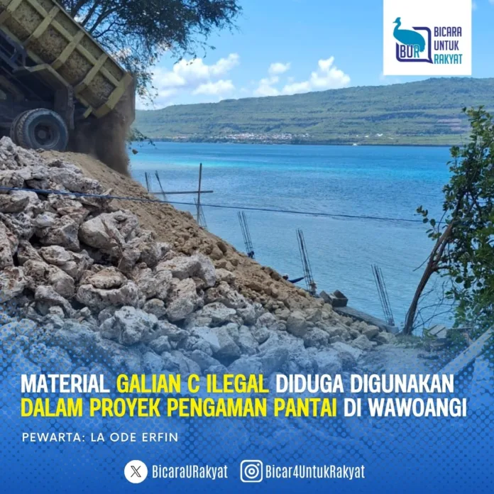 Buton Selatan, 12 November 2025 — Dugaan penggunaan material Galian C ilegal (Mineral Bukan Logam dan Batuan/MBLB) dalam proyek pembangunan pengaman pantai dan tanggul di Desa Wawoangi, Kecamatan Sampolawa, Kabupaten Buton Selatan, kini menjadi sorotan publik. Proyek tersebut diketahui dikerjakan oleh CV. Ghaniyya Cipta Konstruksi, dangan nilai kontrak sebesar Rp.3.715.200.000 (Tiga miliar tujuh ratus lima belas juta dua ratus ribu rupiah).