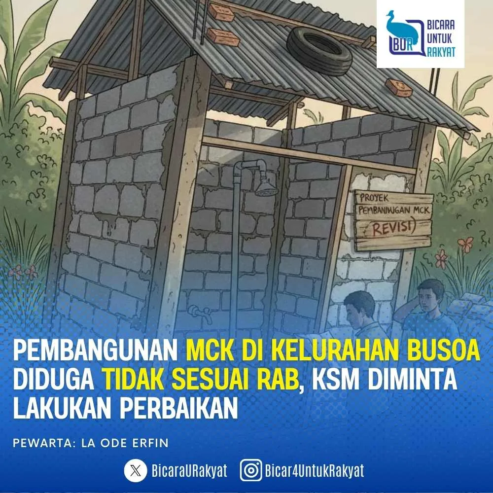 Buton Selatan, 24 November 2025 — Pelaksanaan Program Pembangunan MCK tahun 2025 di Kelurahan Busoa, Kecamatan Batauga, Kabupaten Buton Selatan, diduga tidak sesuai dengan ketentuan teknis sebagaimana tercantum dalam Rencana Anggaran Biaya (RAB) maupun petunjuk pelaksanaan program. Pekerjaan tersebut dikelola oleh Kelompok Swadaya Masyarakat (KSM) Cahaya Berkah.