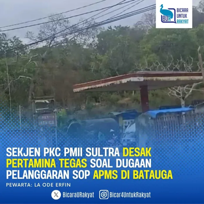 Baubau, 3 Oktober 2025 – Suasana tenang di Kota Baubau mendadak terusik oleh sorotan tajam seorang aktivis, Sekjen PKC PMII Sulawesi Tenggara, Masfandi. Sosok yang tak asing di kalangan pemerhati isu publik ini angkat bicara lantang mengenai dugaan pelanggaran yang dilakukan salah satu Agen Premium dan Minyak Solar (APMS) di Kelurahan Masiri, Kecamatan Batauga, Kabupaten Buton Selatan.