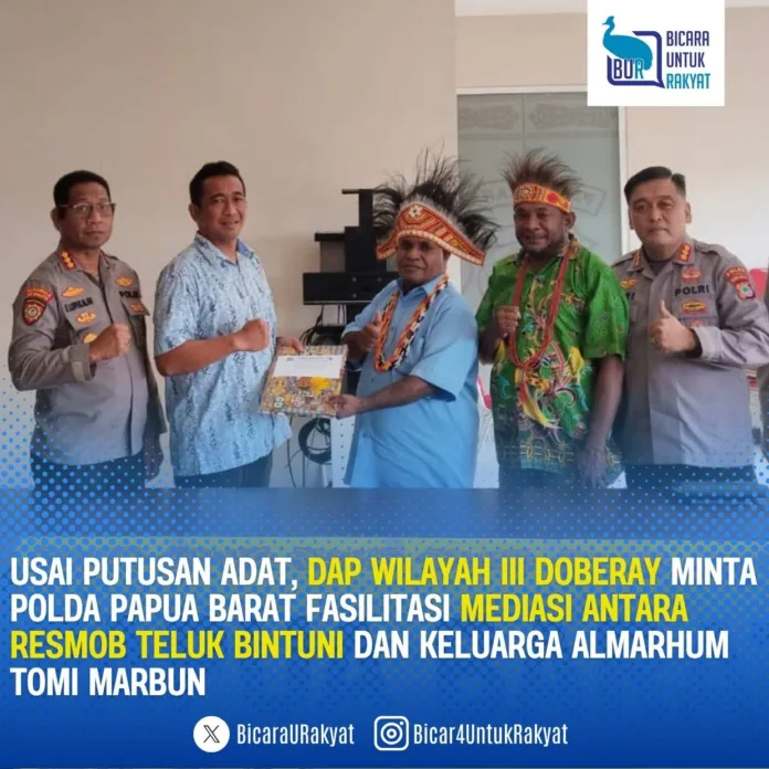Manokwari, 3 Juli 2025 — Setelah Majelis Hakim Adat Papua Wilayah III Doberay menjatuhkan putusan terkait pencemaran nama baik terhadap tujuh anggota Resmob Polres Teluk Bintuni, Dewan Adat Papua Wilayah III Doberay mengajukan permohonan resmi kepada Kapolda Papua Barat untuk memfasilitasi proses mediasi damai antara para pihak.