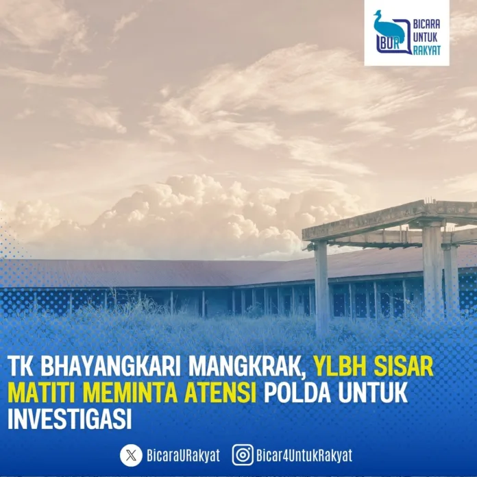 Teluk Bintuni — Yayasan Lembaga Bantuan Hukum (YLBH) Sisar Matiti meminta atensi khusus dari Polda Papua Barat untuk melakukan penyelidikan terhadap proyek pembangunan TK Bhayangkari milik Polres Teluk Bintuni tahun anggaran 2023 yang kini mangkrak dan terbengkalai, meskipun dana proyek sebesar Rp6 miliar telah dicairkan 100 persen.