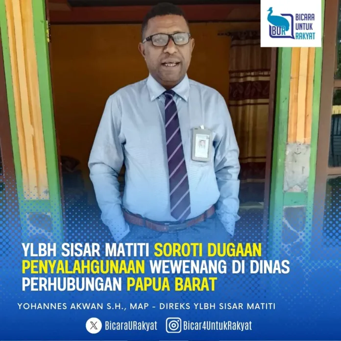 Manokwari, 16 September 2025 — Bagian Riset Yayasan Lembaga Bantuan Hukum (YLBH) Sisar Matiti tengah mendalami dugaan penyalahgunaan kebijakan di lingkungan Dinas Perhubungan Papua Barat. Hal ini disampaikan oleh Direktur Eksekutif YLBH Sisar Matiti, Yohannes Akwan, S.H., M.A.P., C.L.A.
